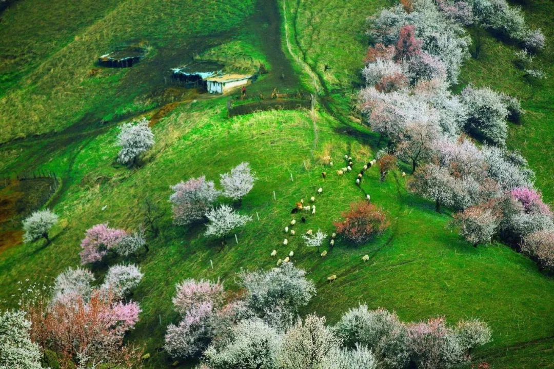 目之所及,是开得绚丽多彩的花儿,是绿草上牛羊的悠闲漫步,世外仙境莫过于是!没来过春日的新疆,没造访过杏花沟,当真不知道春日可以美成这样!