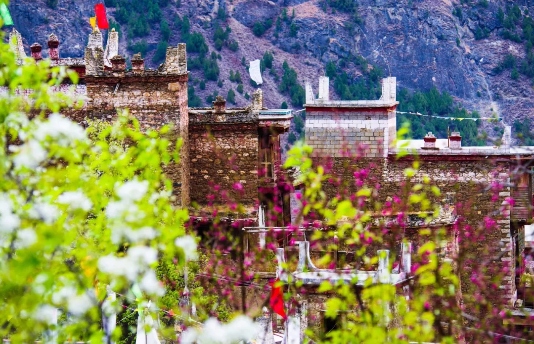 柔媚的桃花,在气势磅礴的雪山怀抱中会绽放出别样的风情。一路上,还有藏民五彩缤纷的经幡,随风飘动,虽不言自成诗。