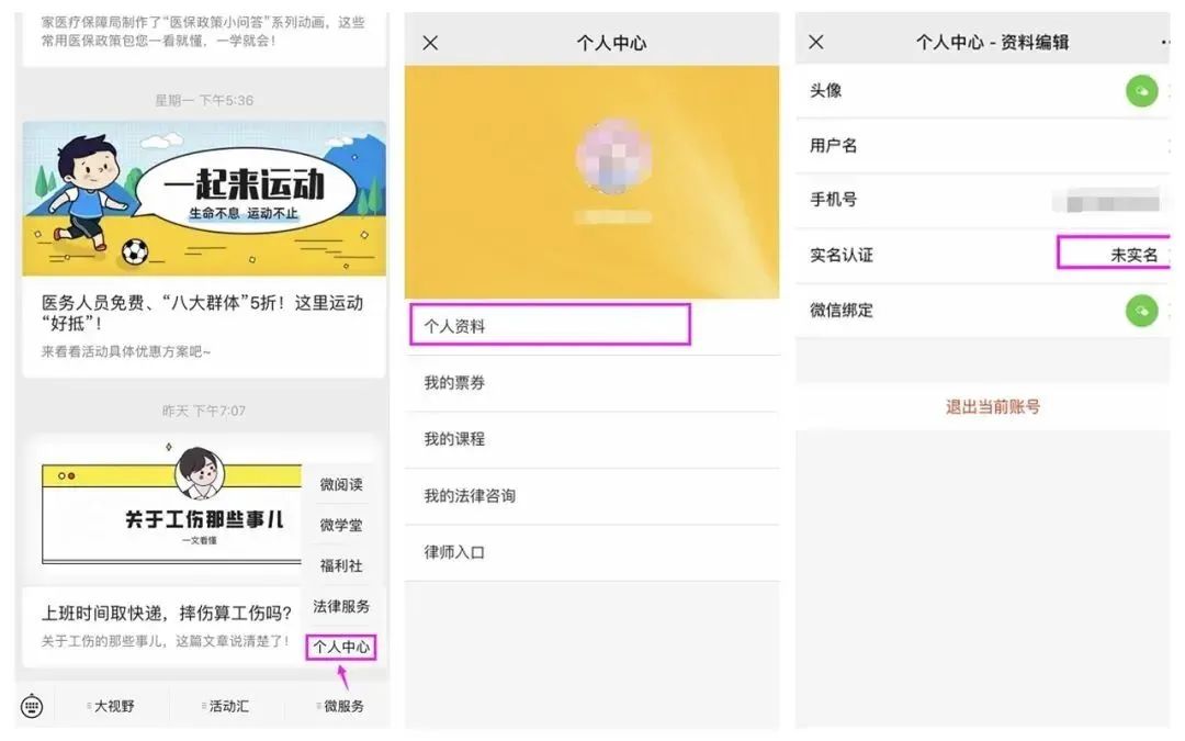 进入“广州工会”微信公众号点击【微服务】点击【个人中心】进入【个人资料】进行【实名认证】;
