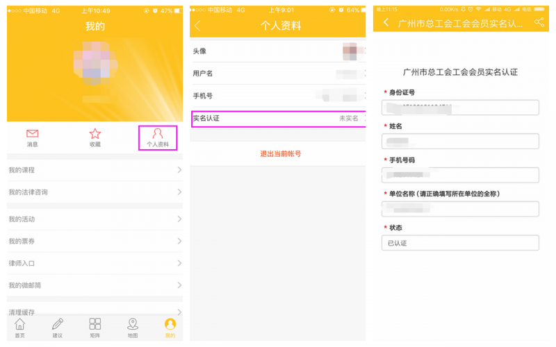 注册“广州工会”APP后点击【个人资料】进行【实名认证】;