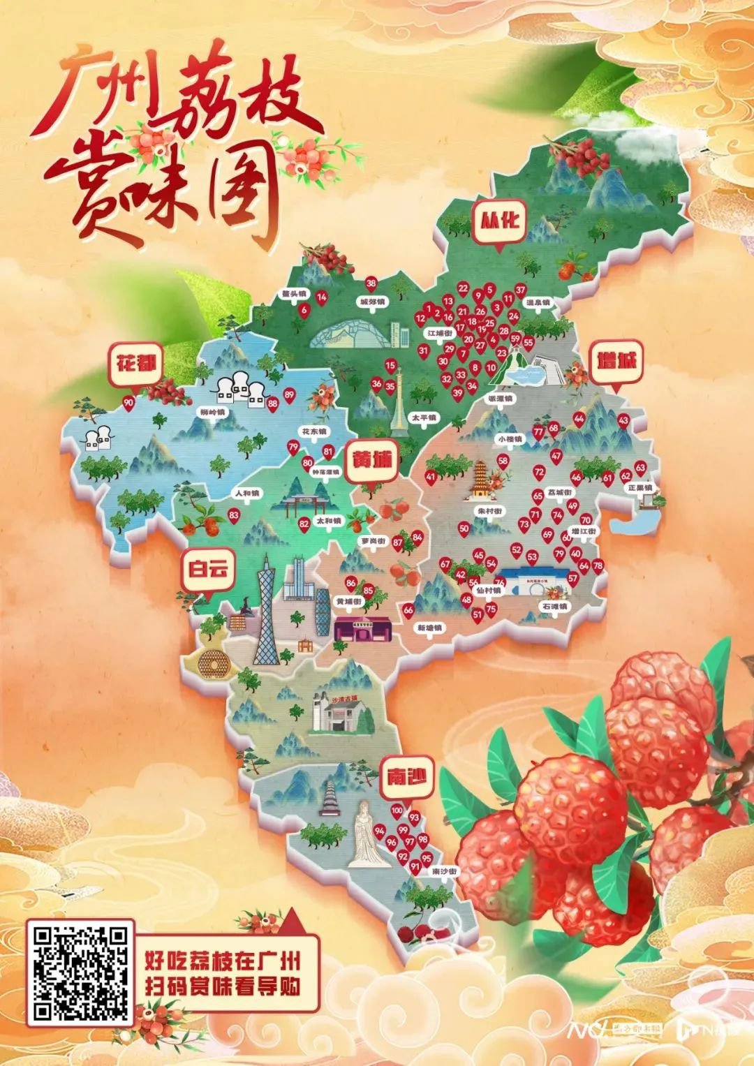 从化、增城、白云、黄埔、南沙和花都6个区共100个荔枝园均在图中,只要按图搜“园”,就可以get到新鲜美味的荔枝。