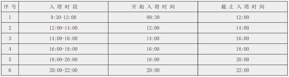 备注:请留意各观光游览时段的截止入塔时间,因游客个人原因错过截止入塔时间不能入塔,造成的损失需由游客自行承担。