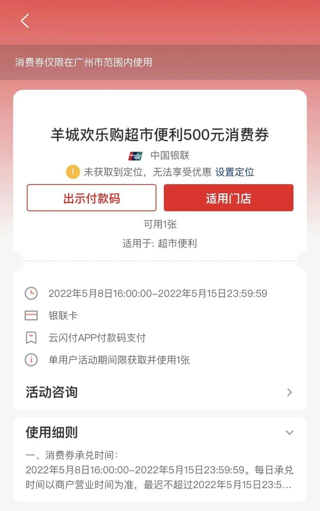 消费者手机打开GPS且定位于广州市,到活动参与商户门店“出示付款码”消费,或到活动电商APP使用云闪付支付,即可抵扣已获取的消费券。