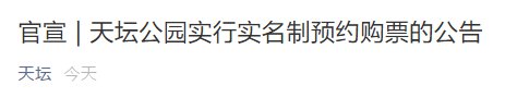 为加强游览秩序管控,保障广大游客安全健康游园,天坛公园自2020年4月28日起实行分时段实名预约购票、实名验票措施。