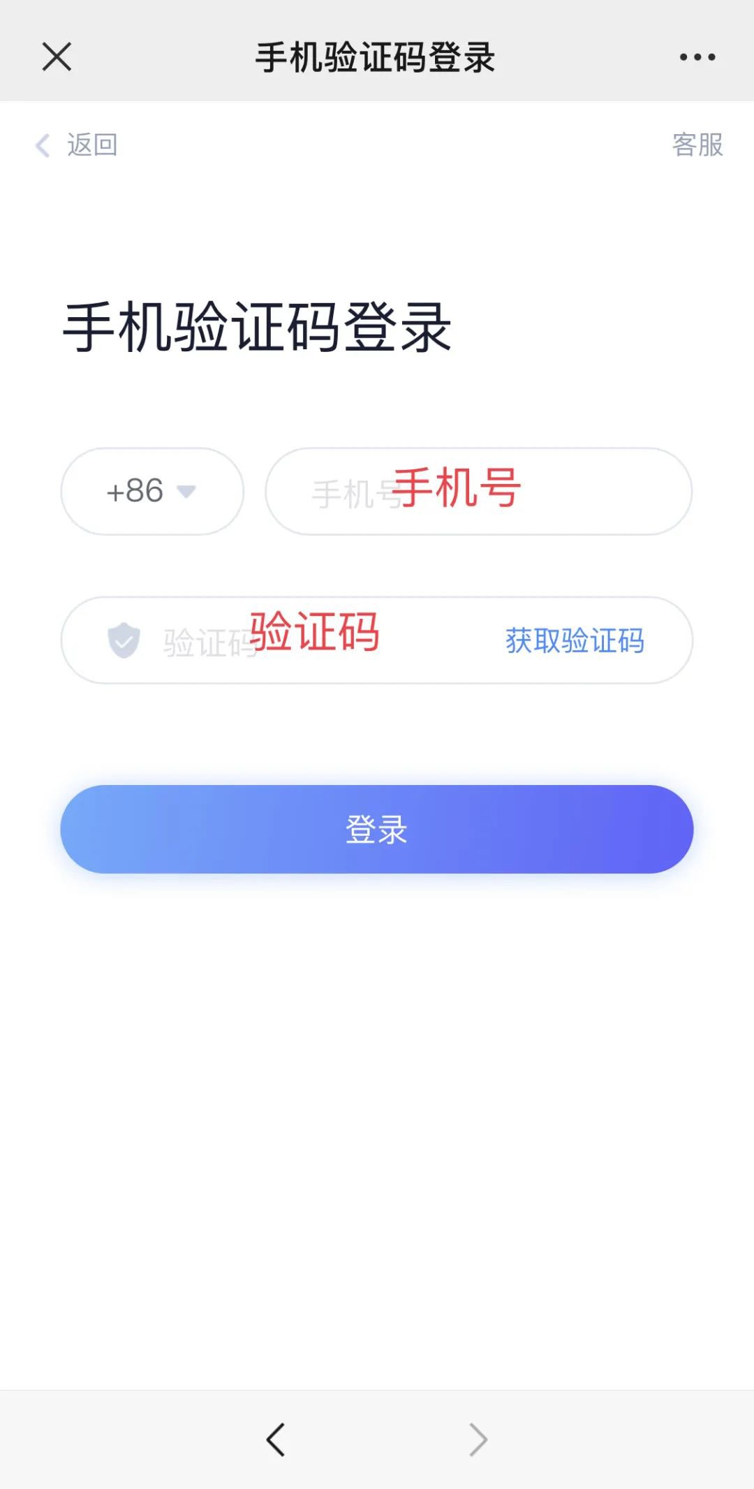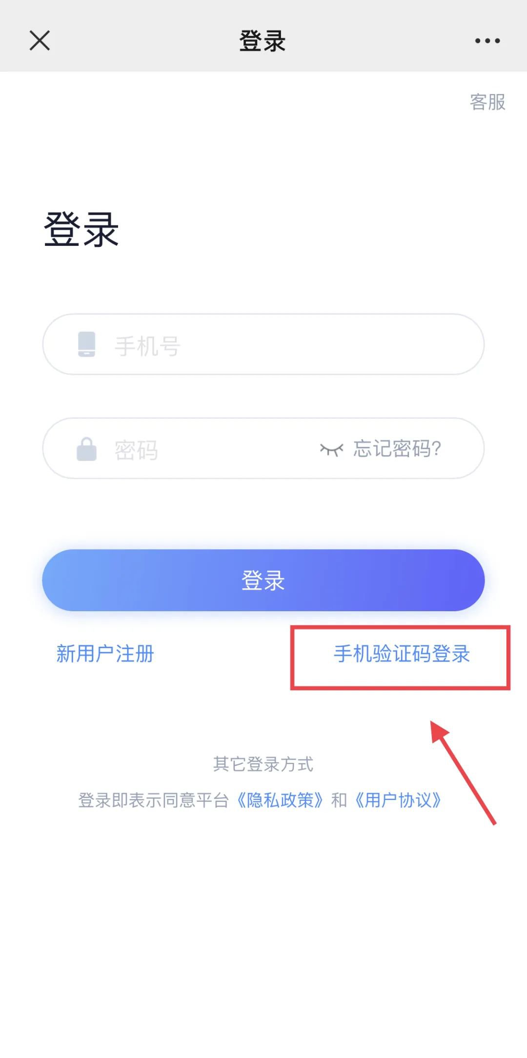 请选择手机验证码登录,输入手机号、验证码,完成登录认证。