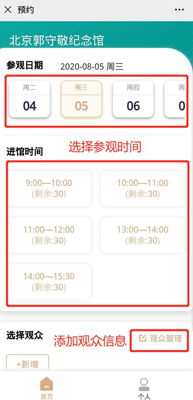 当前实行分时段限额参观制度,请通过纪念馆微信公众号“北京郭守敬纪念馆”进行实名预约。每部手机最多可同时预约5人,每人每天限预约1次。