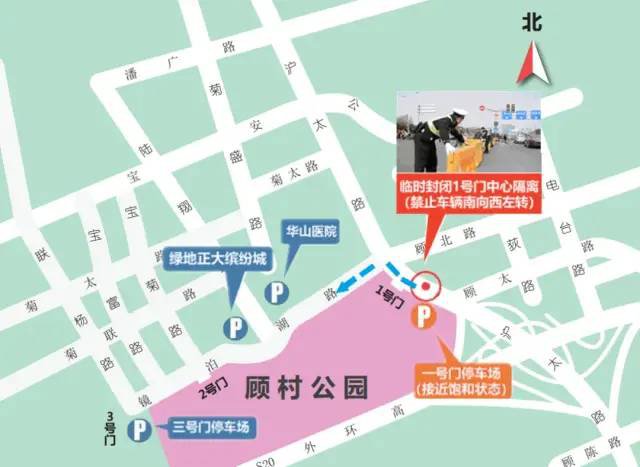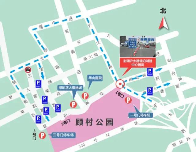 ➤ 措施一:当沪太路顾村公园1号门停车场接近饱和时,封闭公园1号门中心隔离,机动车至沪太路镜泊湖路左转,沿镜泊湖路按绿地正大缤纷城、公园3号门停车场、华山医院顺序依次有序停车。