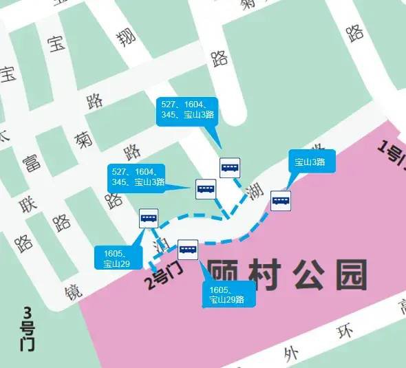 ➤ 2号门:镜泊湖路沿线公交线路有宝山3路、1604路、527路等线路。527路、1604路、宝山3路镜泊湖路陆翔路站下车,向西步行约300米达到公园2号门;1605路和宝山29路镜泊湖路宝菊路站下车,步行至路口南侧即到达公园2号门。
