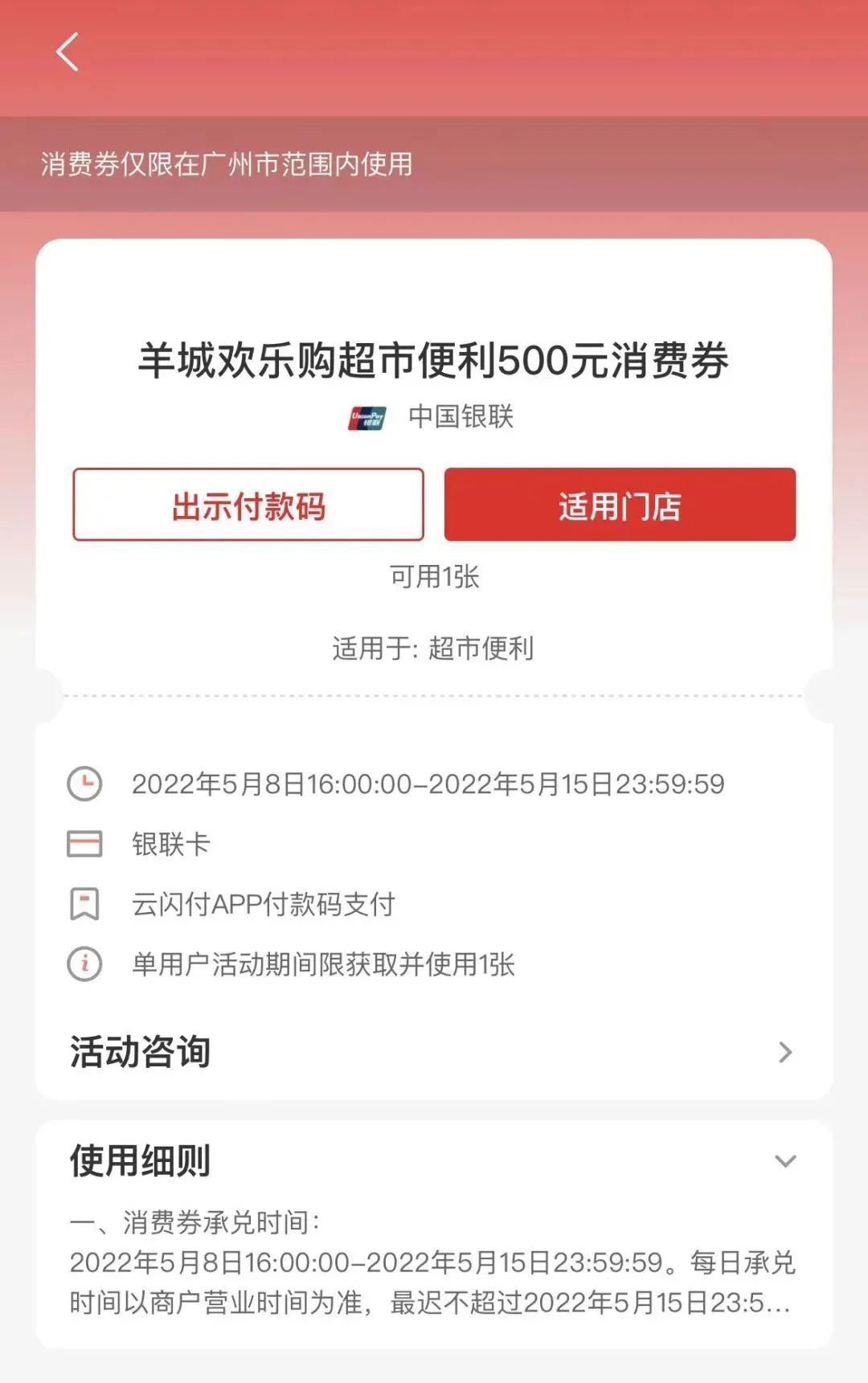 消费者手机打开GPS且定位于广州市,到活动参与商户门店“出示付款码”消费,或到活动电商APP使用云闪付支付,即可抵扣已获取的消费券。