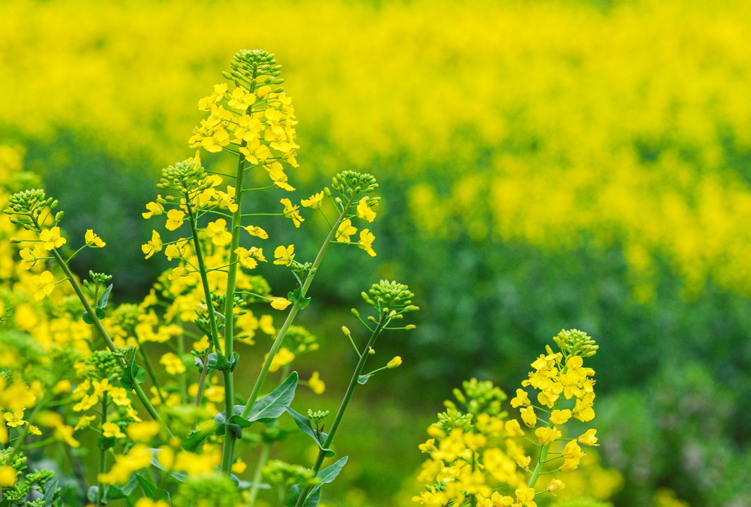 阳春三月,金灿灿的油菜花成片绽放,与绿树相映衬,增添着无限的诗情与画意,美不胜收;在漫山遍野金黄色的油菜花田中掩映着岁月静好的乡村,美好时光倏然来临。