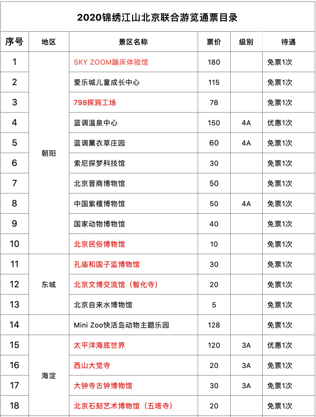 2020版通票新增北京龙脉温泉、太平洋海底世界、798探洞工场、蓝调薰衣草庄园、蓝调庄园温泉中心、快活岛动物主题乐园、SKY ZOOM蹦床体验馆、爱乐城儿童成长体验中心、北京上方山国家森林公园、云水洞、银狐洞、妙峰山、周口店遗址博物馆、京西十八潭、张裕爱斐堡国际酒庄、云居寺、古崖居等40家新场馆。