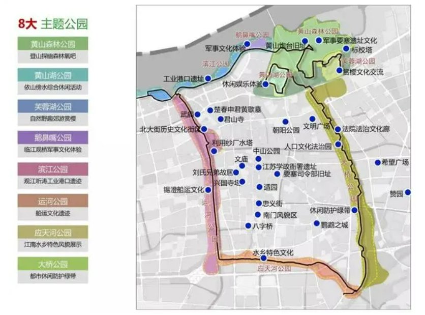 路线:东沿大桥公园、永安绿苑,北接芙蓉湖公园、黄山森林公园、滨江公园,西通锡澄运河公园,南联应天河公园后,与大桥公园环通,形成“城在绿中、人在景中”的独特格局。