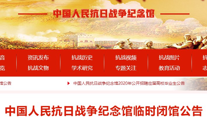 中国人民抗日战争纪念馆自7月3日起临时闭馆,暂停对外开放,预计7月7日12:00恢复有序开放。由此带来的不便,请各界观众朋友予以谅解。
