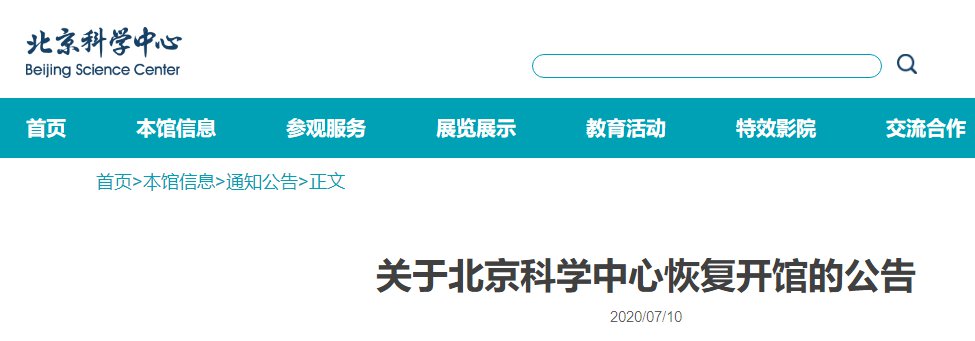 根据当前北京市疫情防控形势,在严格落实疫情防控要求的前提下,北京科学中心自2020年7月15日(周三)起将有序恢复开放,为保障观众安全健康及良好的参观体验,现将有关事项通告如下: