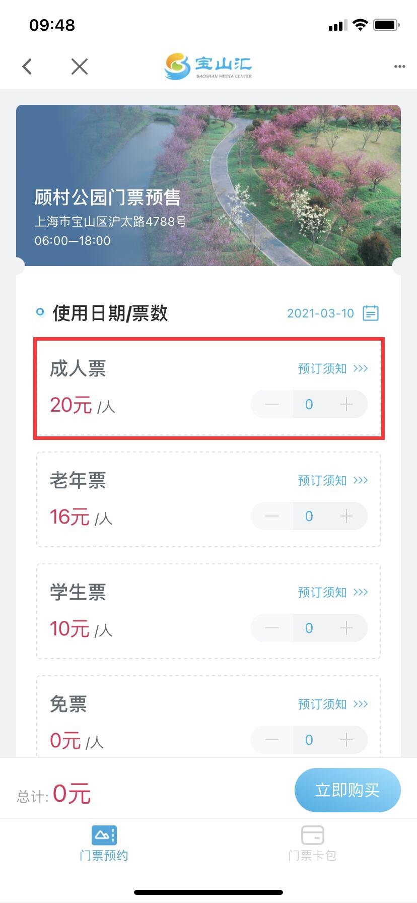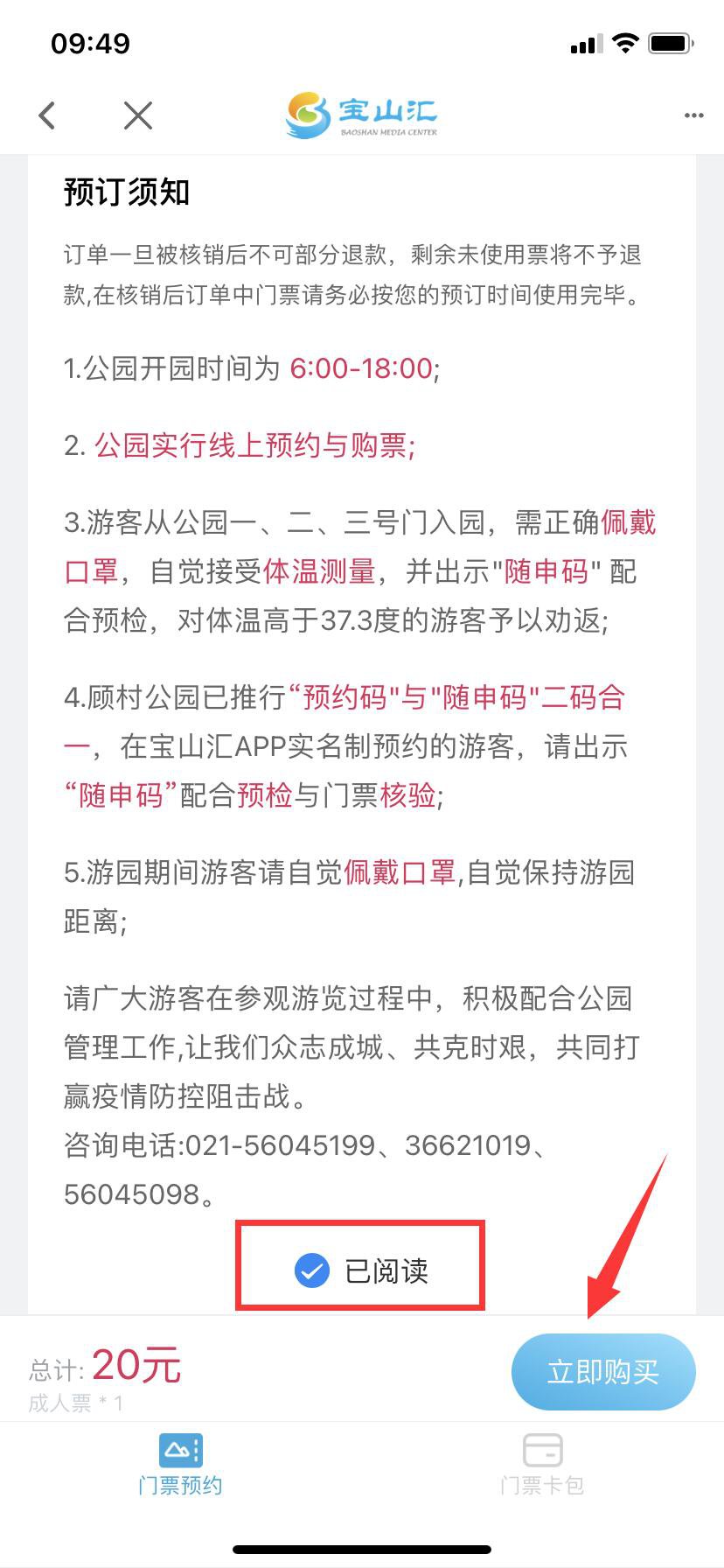 4、进入购票页面,选择所需票种,查阅预订须知,勾选【已阅读】,点击立即购买;