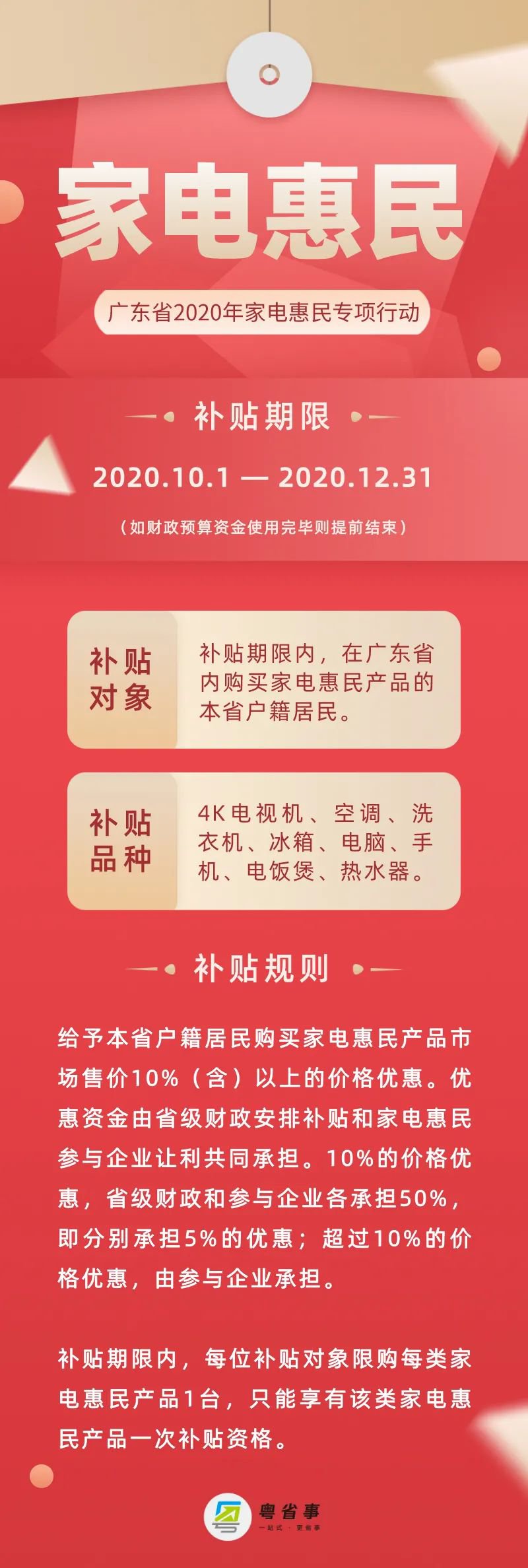 补贴期限内,在广东省内购买家电惠民产品的广东省户籍居民。补贴期间为2020年10月1日起至2020年12月31日。