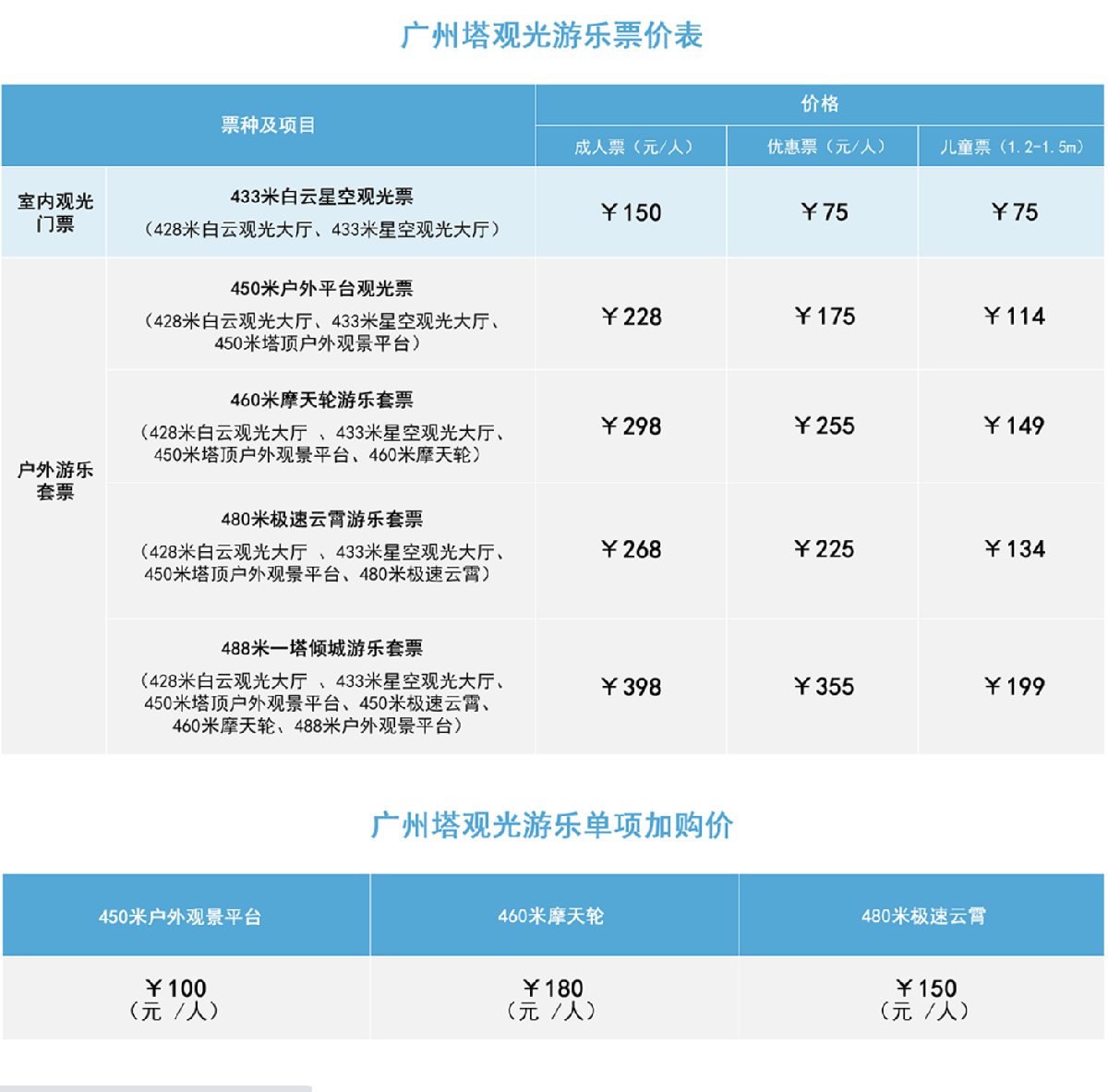 广州塔塔身168~334.4米处设有“蜘蛛侠栈道”,是世界最高最长的空中漫步云梯 。塔身422.8米处设有旋转餐厅,是世界最高的旋转餐厅 。塔身顶部450~454米处设有摩天轮,是世界最高摩天轮 。天线桅杆455~485米处设有“极速云霄”速降游乐项目,是世界最高的垂直速降游乐项目 。天线桅杆488米处设有户外摄影观景平台,是世界最高的户外观景平台,超越了迪拜哈利法塔的442米室外观景平台,以及加拿大国家电视塔447米的“天空之盖”的高度。
