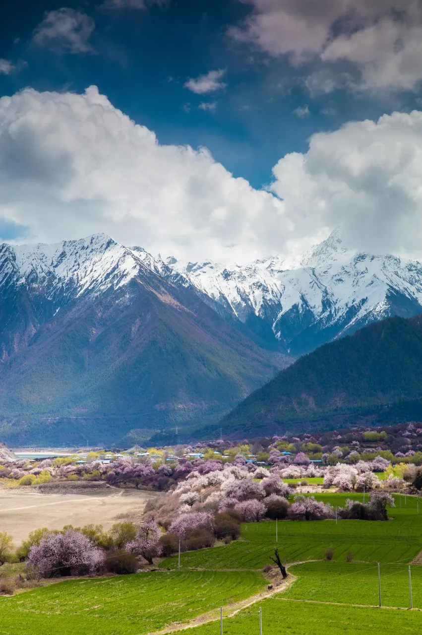 山顶的雪花与河谷的梨花竞相争艳,蓝天白云之下,绿树村寨之间,这便是三月最美的大地。