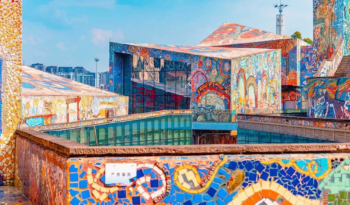 罗中立美术馆位于四川美术学院大学城校区内,由知名艺术家罗中立、郝大鹏等设计建造,外墙由碎瓷片拼成了色彩斑斓的图案,绚丽又先锋,非常地醒目。