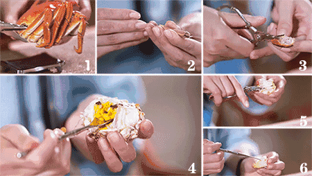 1-2:先吃蟹腿肉,剪开蟹腿两头,用蟹镊捅出;