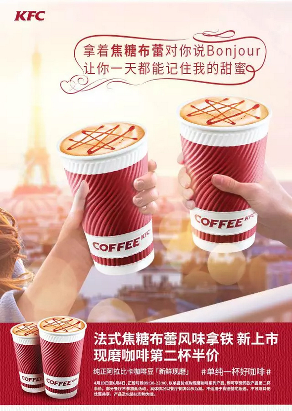 活动内容:法式焦糖布蕾风味拿铁4月10日起全新上市,现在就来肯德基,现磨咖啡系列产品第二杯半价,让焦糖布蕾的浪漫气息感染你我,随时随地让奇遇上演。