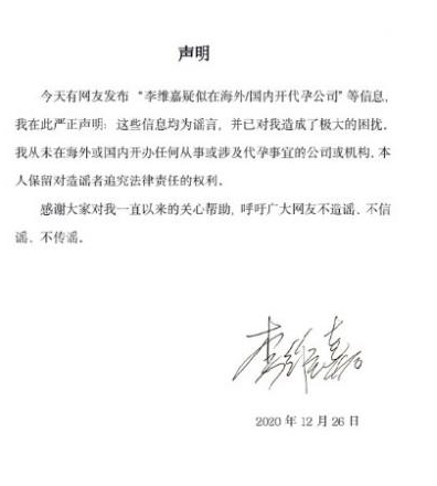 26日晚,李维嘉就“开代孕公司”传言做出回应,李维嘉称这些信息均为谣言,自己从未在海外或国内开办任何从事或涉及代孕事宜的公司或机构。并呼吁网友不信谣不传谣。