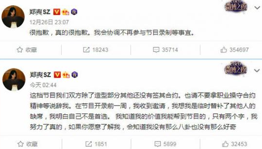 26日晚,郑爽发文称将不再参与《追光吧哥哥》的录制,27日凌晨又发文称自己不是该节目的首选,自己是临时替补了其他人的缺席。