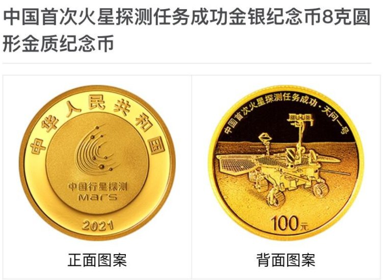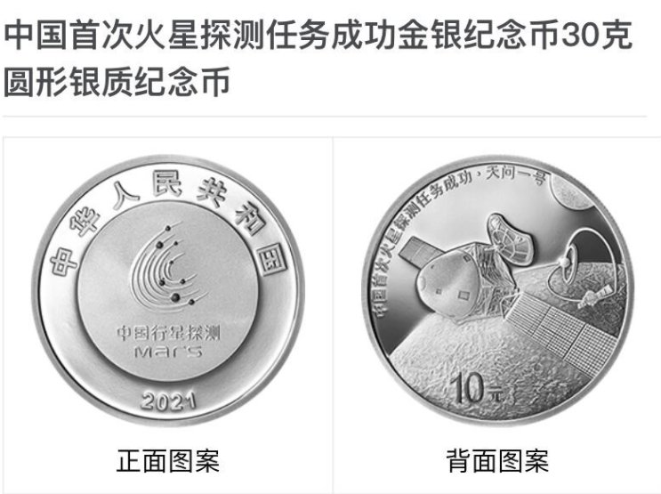 中国人民银行定于2021年8月30日发行中国首次火星探测任务成功金银纪念币一套。该套纪念币共3枚,其中金质纪念币2枚,银质纪念币1枚,均为中华人民共和国法定货币。