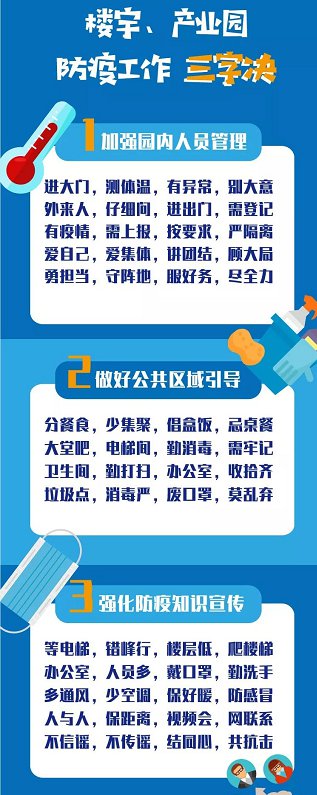 企业复工之前,姑苏区还提前选取联实大厦、蓝•芳华产业园作为示范点,拍摄入口、电梯、卫生间、废弃口罩专用垃圾箱等部位的防疫措施样例照片,附上文字说明,编写了《楼宇、产业园疫情防控范例》,发布在“联盟”微信群,直观地指导楼宇、产业园运营方正确开展防疫工作、顺利进行复工。针对部分楼宇、产业园反映的防疫物资紧缺、采购困难影响复工的问题,区发改局积极协调对接爱心企业捐助资源,陆续帮助解决需求。各街道也积极为楼宇、产业园复工助力。苏锦街道为辖区楼宇开发了线上复工平台,企业员工在家注册个人信息,上班不用纸笔登记,只需展示二维码就能快速核实身份入楼。