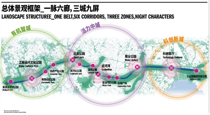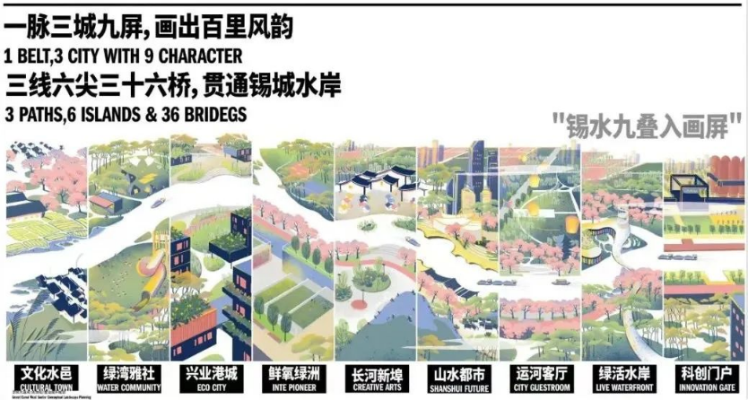 此次规划范围为京杭大运河无锡段41.5公里长河口线向外扩展60米及部分景观节点,总面积11.98平方公里,扣除水域后陆域面积7.2平方公里。从深挖大运河文化内涵、解决实际问题入手,规划提出“百里画廊、锡城新韵”的设计主题,以及“一脉三城九屏、画出百里风韵;三线六尖三十六桥,贯通锡澄水岸”的整体空间结构,结合运河湾等重点项目以及运河“河尖”“河湾”地区的独特地理特征