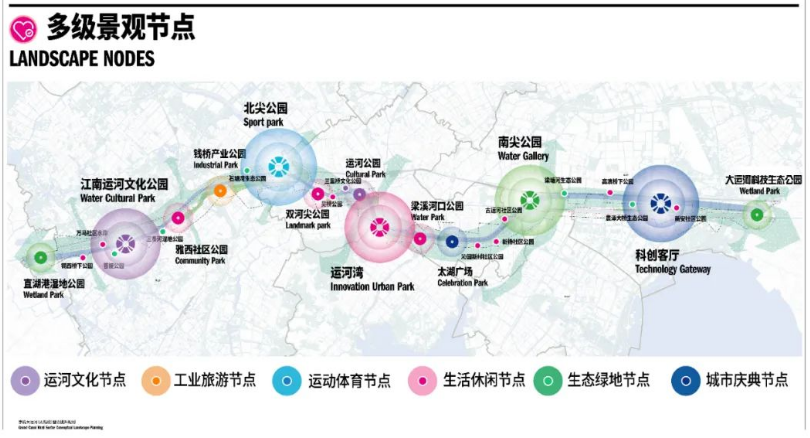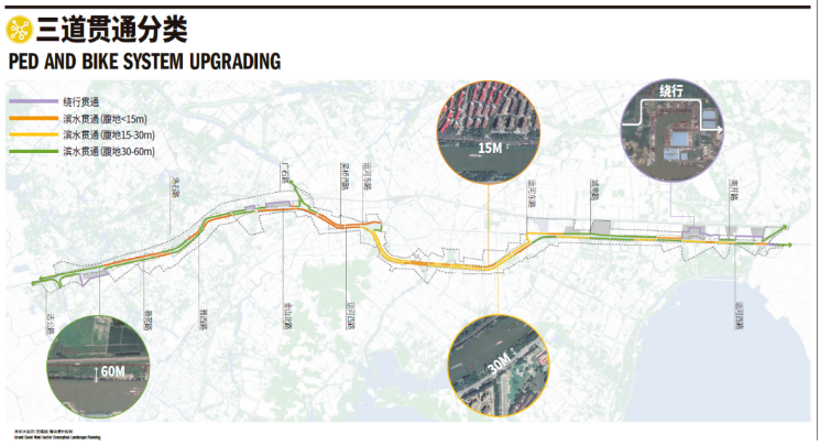 设计的最大亮点,是贯通运河两岸的105公里慢行道(包括跑道、骑行道和步行道)和生态绿廊。