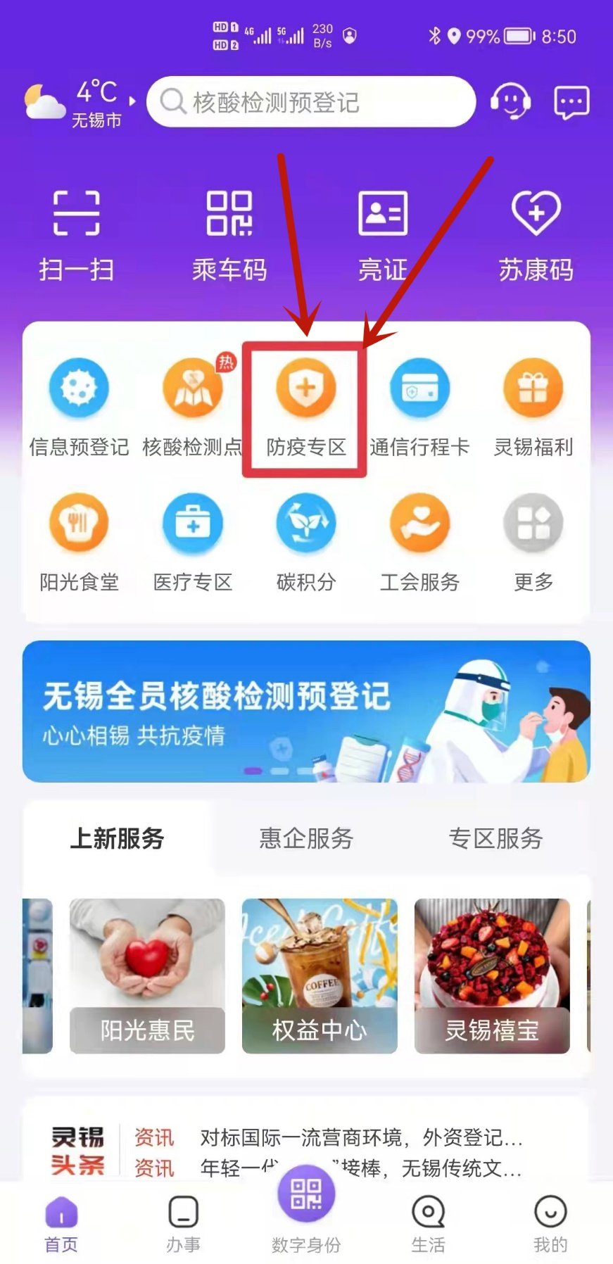 1、打开“灵锡”APP—进入“防疫专区”