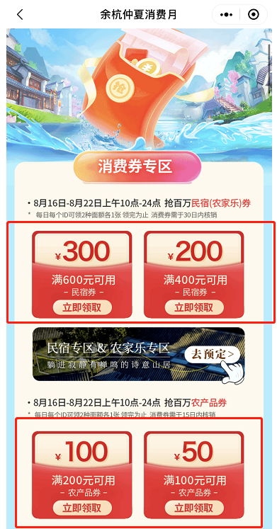 消费券领取时间:第一期发放时间8月16-8月22日,每天10时-24时定量发放。先到先得,抢完即止。