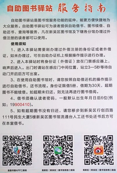 24小时自助图书馆位于硕放文化中心一层,虽然不是很大,但却五脏俱全。自助图书驿站2019年12月20日启用,2020年4月16日重新开放,目前有各类新书1500余册,种类囊括幼儿绘本、儿童书籍、成人书籍,今后驿站还会针对借阅需求每月定期增补书籍。