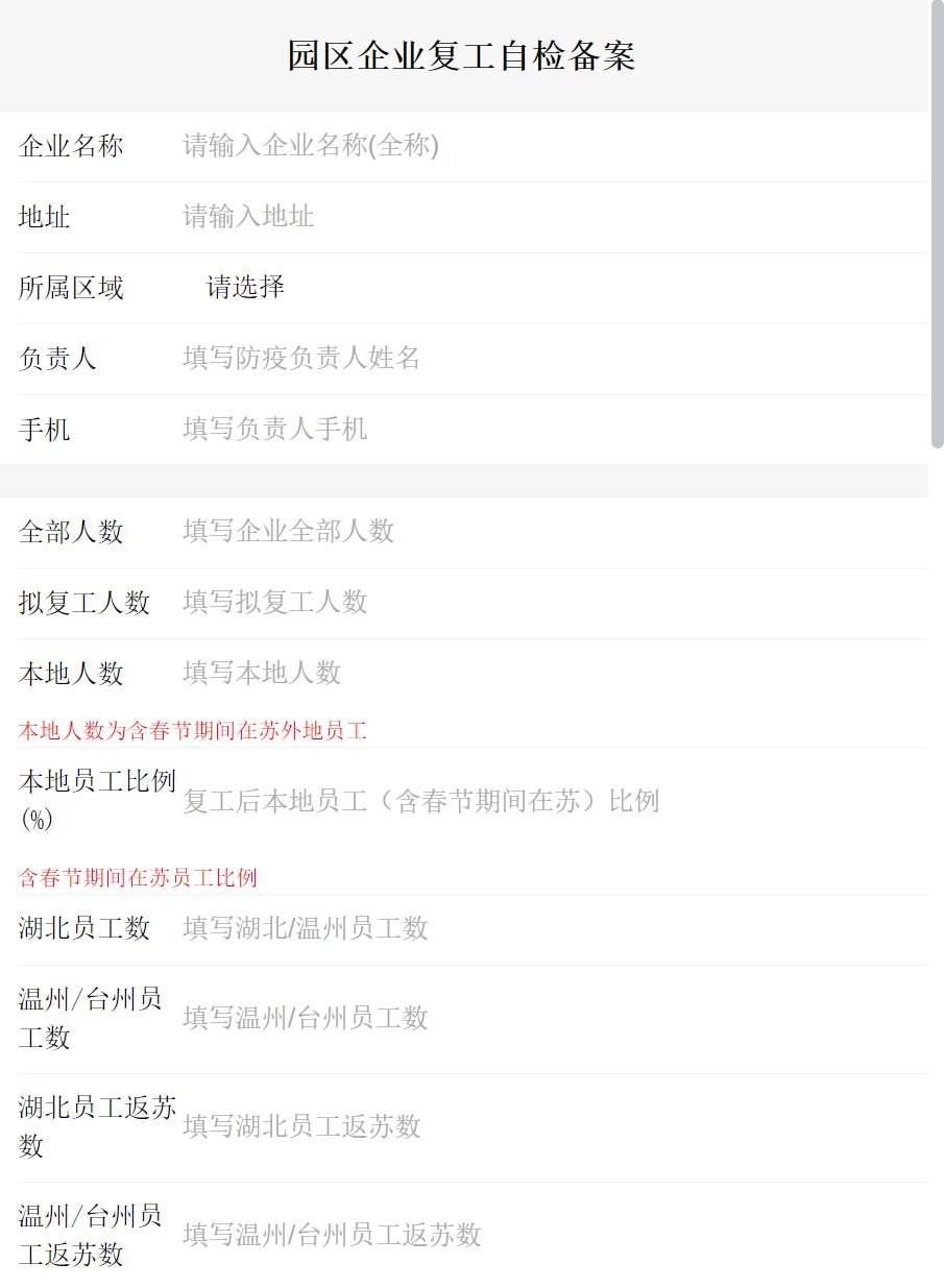 需按系统提示填写企业全称、地址、所属功能区、防疫负责人、手机等基本信息;填写企业全部人数、拟复工人数、本地(含春节期间在苏外地员工)人数、湖北/温州/台州员工数,湖北/温州/台州员工返苏数、其他外地员工返苏数、返苏员工是否按要求开展隔离观察等。