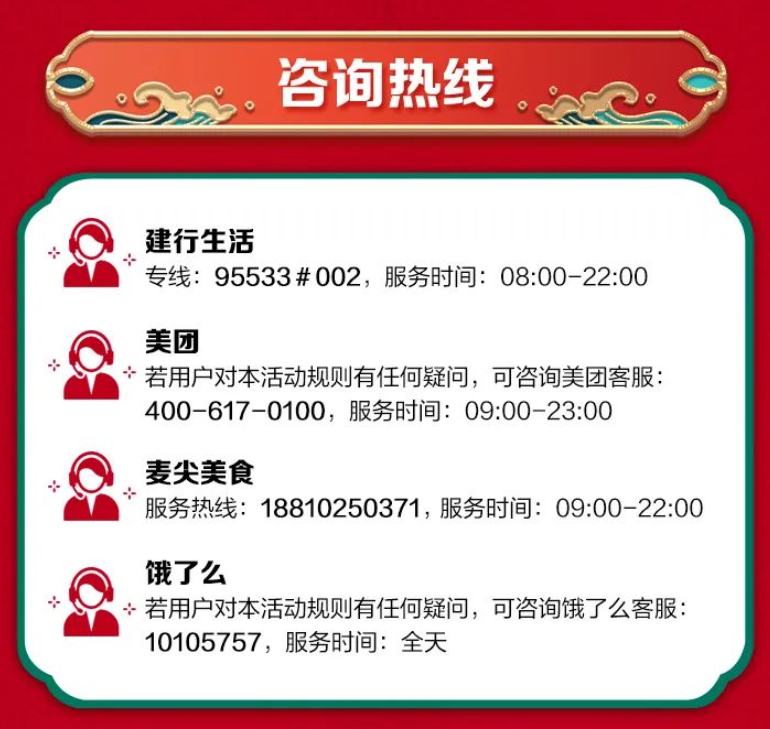 发放平台:建行生活APP、美团APP、美团外卖APP、饿了么APP(仅外卖)、麦尖美食APP;京东、银联等平台也将陆续启动发放消费券。