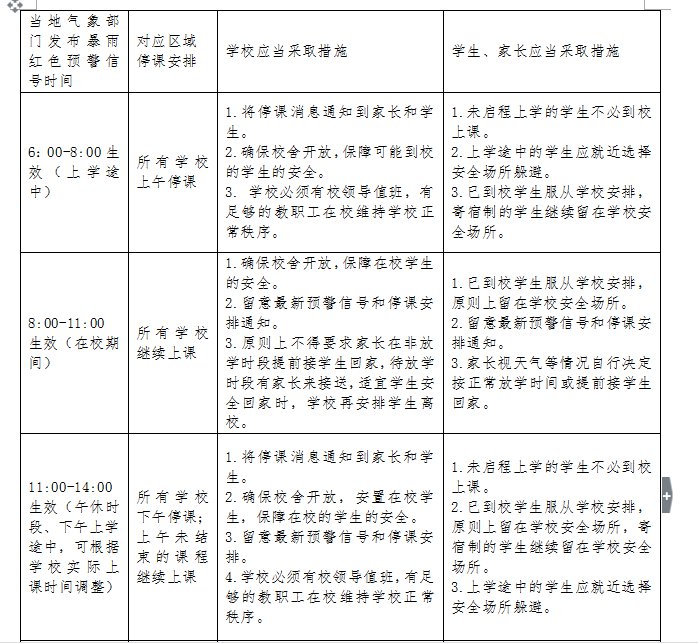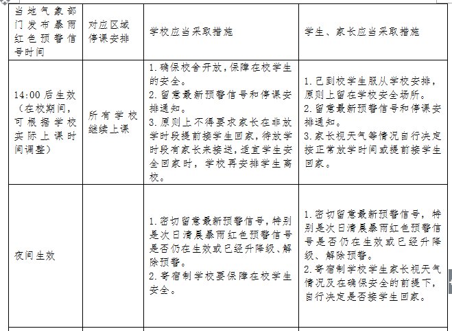 暴雨红色预警信号、台风黄色预警信号、台风橙色预警信号、台风红色预警信号均为停课信号,学校、家长、学生需要根据暴雨台风天气的具体情形做出不同的安排。