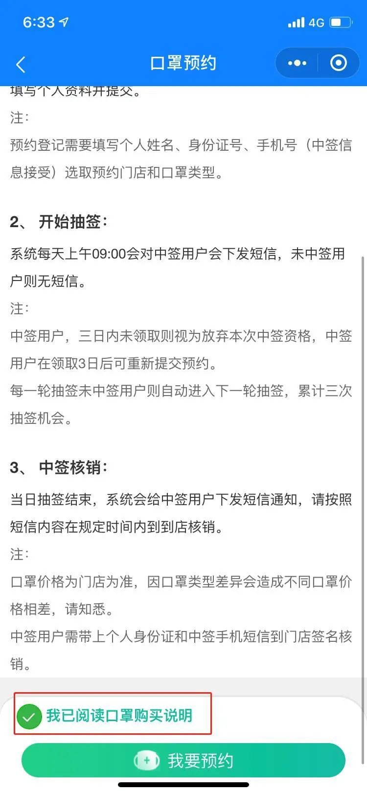 4、查看口罩预约说明,拉至最下方选择【我已阅读口罩购买说明】,然后点击【我要预约】