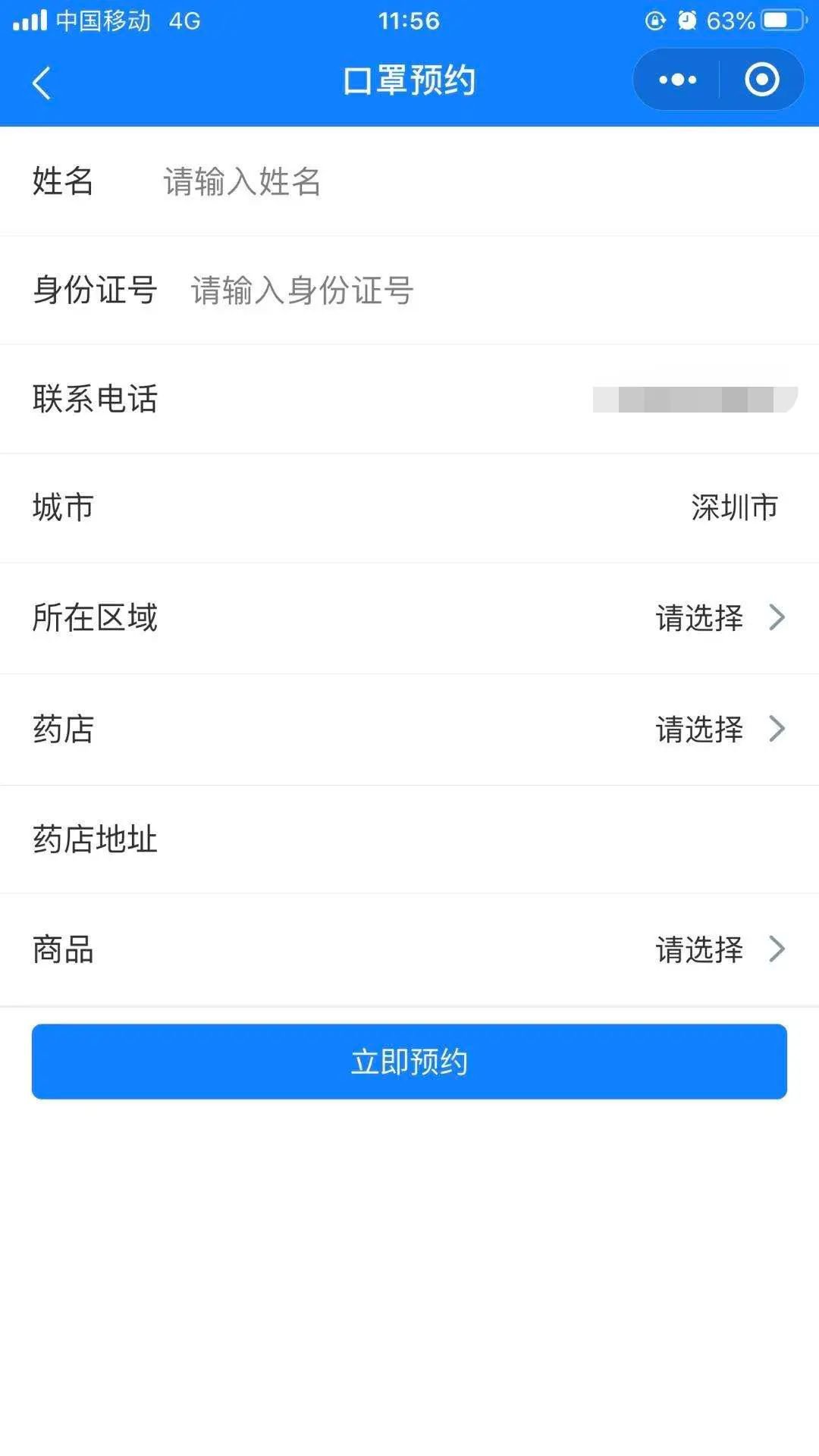 5、请真实填写个人姓名及身份证号、联系电话信息,选择所在区域及就近门店。提醒:预约前手机需打开定位功能,否则城市选择那里会是空白
