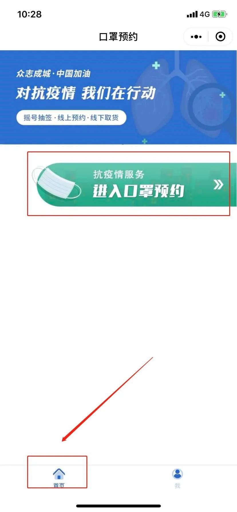 3、登录之后点击最下方的【首页】,再点击【进入口罩预约】服务页面