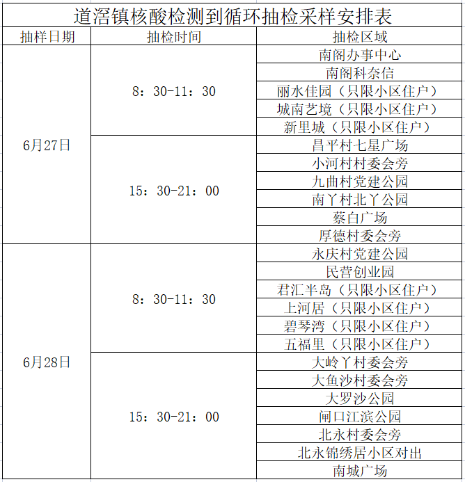 根据疫情防控需要,道滘镇核酸检测开展循环抽检工作,于6月27日-28日分区分时间段开展,当天抽检居住所属村所有人员需参加免费核酸检测。