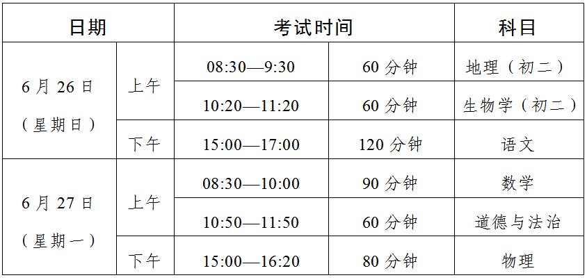 二、体育与健康、音乐、美术、信息技术等科目及物理、化学、生物实验操作等初中学业水平考试的具体时间,由各地市根据本地实际情况确定。非委托省命题地市初中学业水平考试时间,由相关市自行确定。