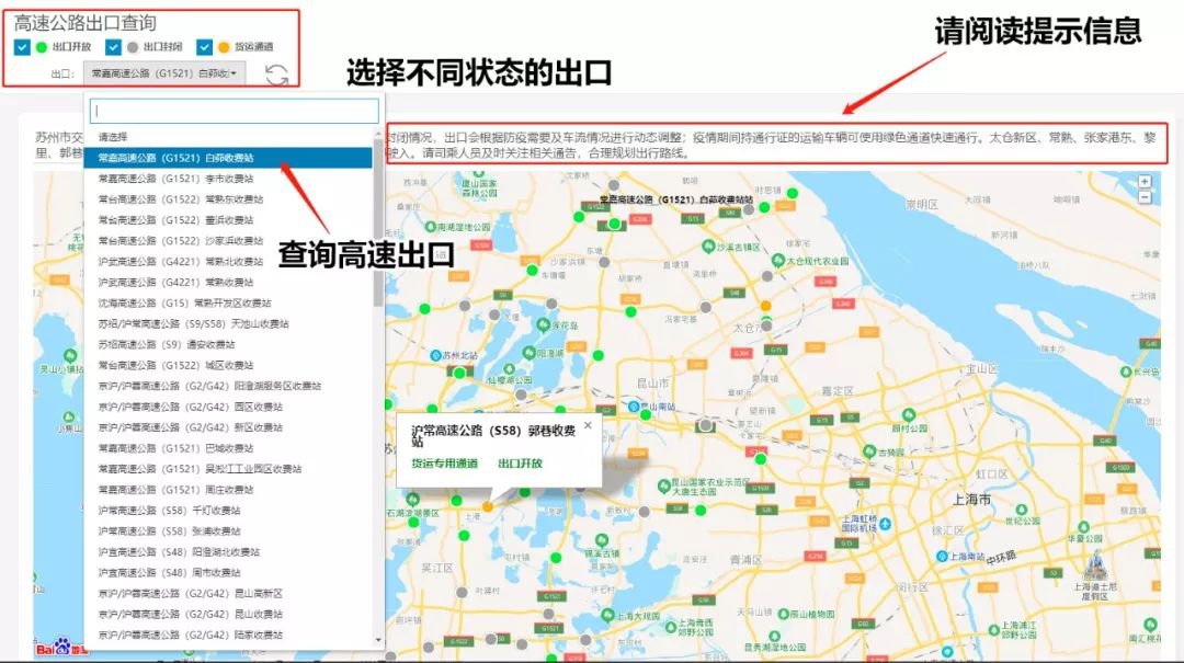 您可查看高速公路收费站出口开放/封闭的情况名称、位置、当前实时状态。