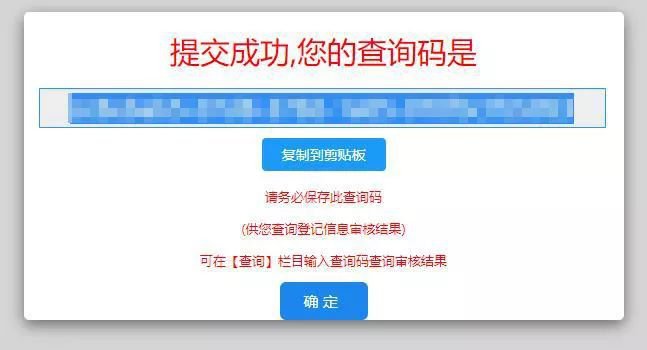 2、填写完毕信息后点击“提交”。提交完毕后会弹出“提交成功”和“查询码”。请务必记住保存查询码。