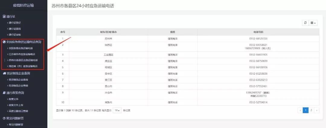网页端通过全国应急物资运输电话查询菜单进入进行分类的查看。。