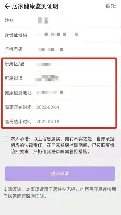 (四)如信息核对有误,请点击页面右上角“编辑”进行修改,提交后耐心等待后台审核。审核结果将以短信和APP消息推送的形式通知申请人,审核通过后完成信息核对即可领取“居家健康监测证明”。