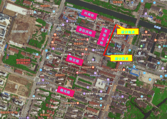 河南街是梅村街道内一条东西走向的城市支路,根据老路调查情况及老路挖检情况显示,老路现状路面较差,病害较多,以及路基路面结构较差,故本次将对道路进行改建,铺设雨、污水等管线,并在适当位置增设停车位。同时,应环保要求将于河南街与梅村中路交叉口西北角新建一座初期雨水调蓄池。