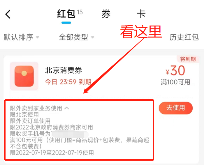 领取到的消费券使用说明具体查看【饿了么APP-我的-红包卡券-北京消费券】,如下图。消费券可能延迟到账,请稍后查看。