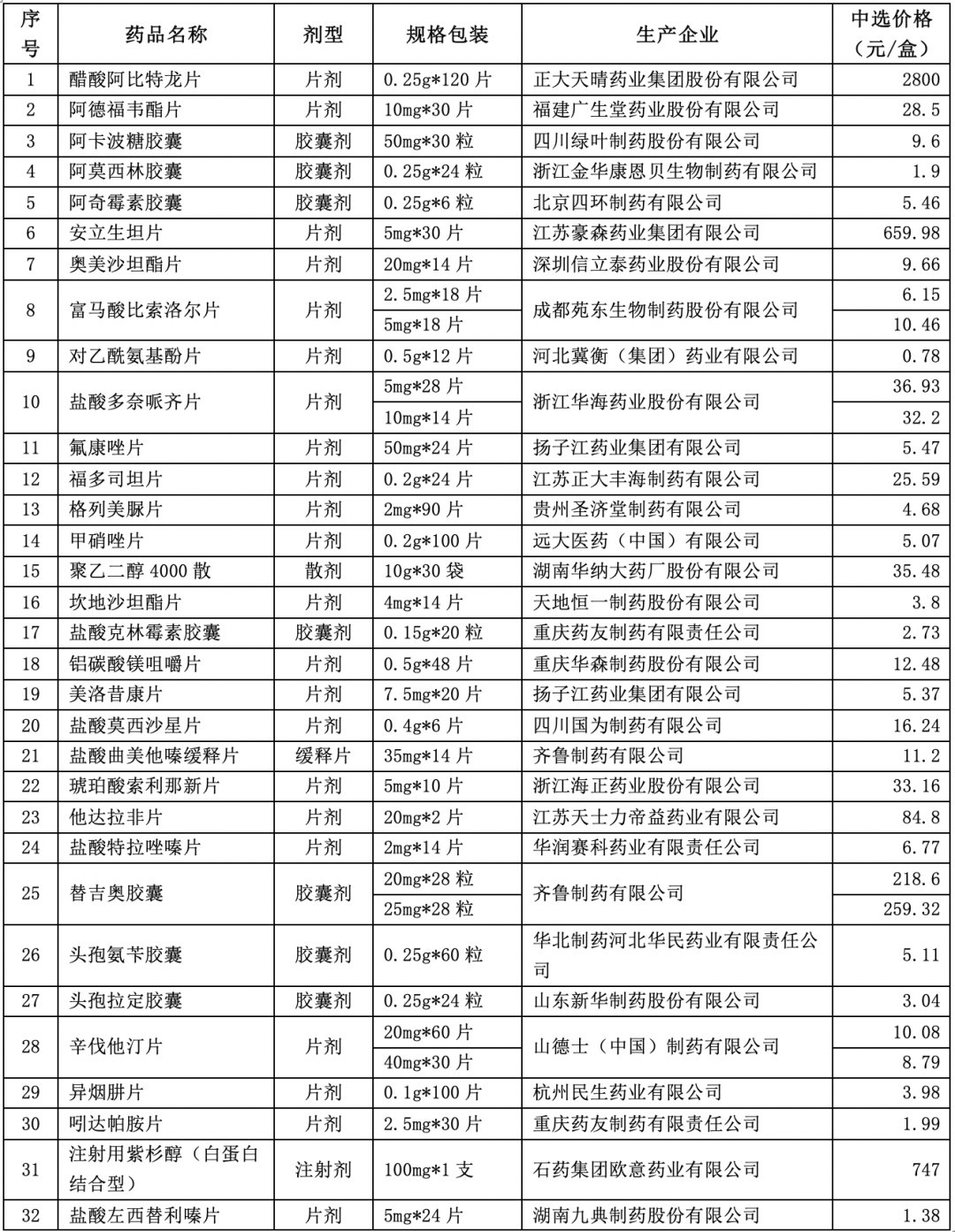 第二批国家集采药品(江苏)中选结果及供应品种清单