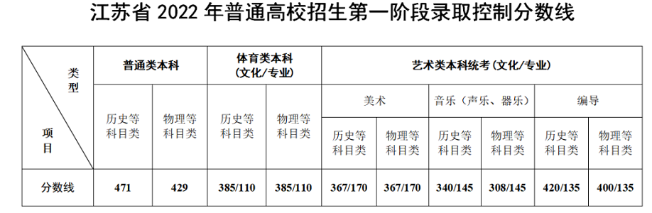 2022年江苏省普通高校招生第一阶段录取控制分数线